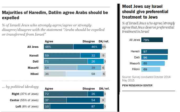 5. In Pew Research Centre’s survey Israel’s Religiously Divided Society in 2016 a plurality of Israeli Jews, 48 %, supported the physical expulsion of Israeli Arabs as opposed to 46% who were opposed. In other words, stripping out the don’t knows, a majority of Israeli Jews support making Israel a purely Jewish ethnic state.