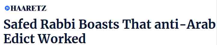 14. In another Jewish city in the Galilee, Safed, the Chief Rabbi, Shmuel Eliyahu, a paid employee of the state i.e. a civil servant, together with 17 other rabbis, issued an edict forbidding its inhabitants from renting or leasing apartments to Arabs. When the edict ran into the inevitable criticism dozens of Israel’s municipal chief rabbis signed a religious ruling forbidding the rental of homes to non-Jews. Like the demonstration in Afula, this is part and parcel of what it means to live in a Jewish state.