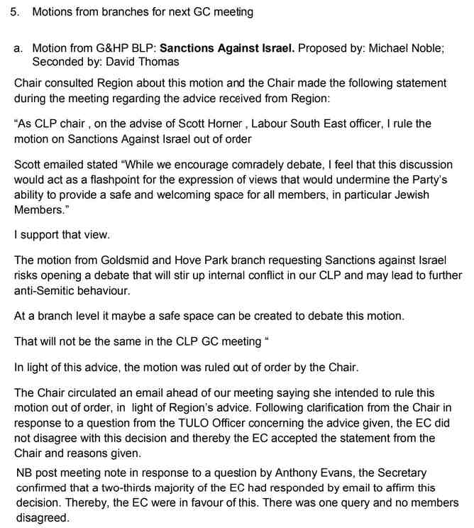 ““As CLP chair , on the advise (sic!) of Scott Horner , Labour South East officer, I rule the motion on Sanctions Against Israel out of order