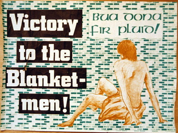 In response, republican prisoners began a series of protests to regain the lost privileges, as well as the symbolic importance of prisoner of war status. This included the right to wear one’s own clothes, free association and exemption from prison work. IRA volunteer Kieran Nugent began the ‘blanket protest’ when he refused to wear a prison uniform. Thrown into his cell naked, he draped himself in the only thing available – a grey, prison-issue blanket.