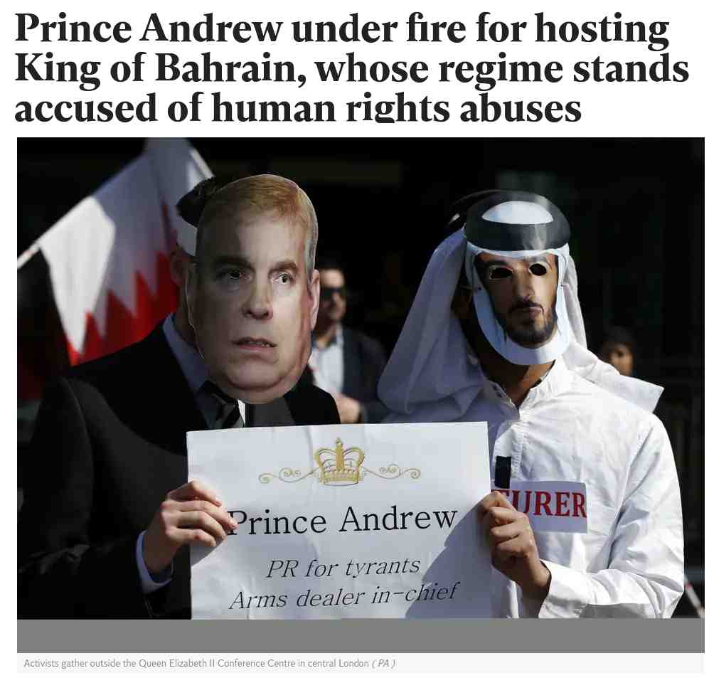 Andrew is a particularly despicable specimen having previously acted as a conduit for arms deals with regimes that have atrocious human rights records such as Kazakhstan. He has hosted the King of Bahrain who had doctors who tended to the wounds of demonstrators tortured.