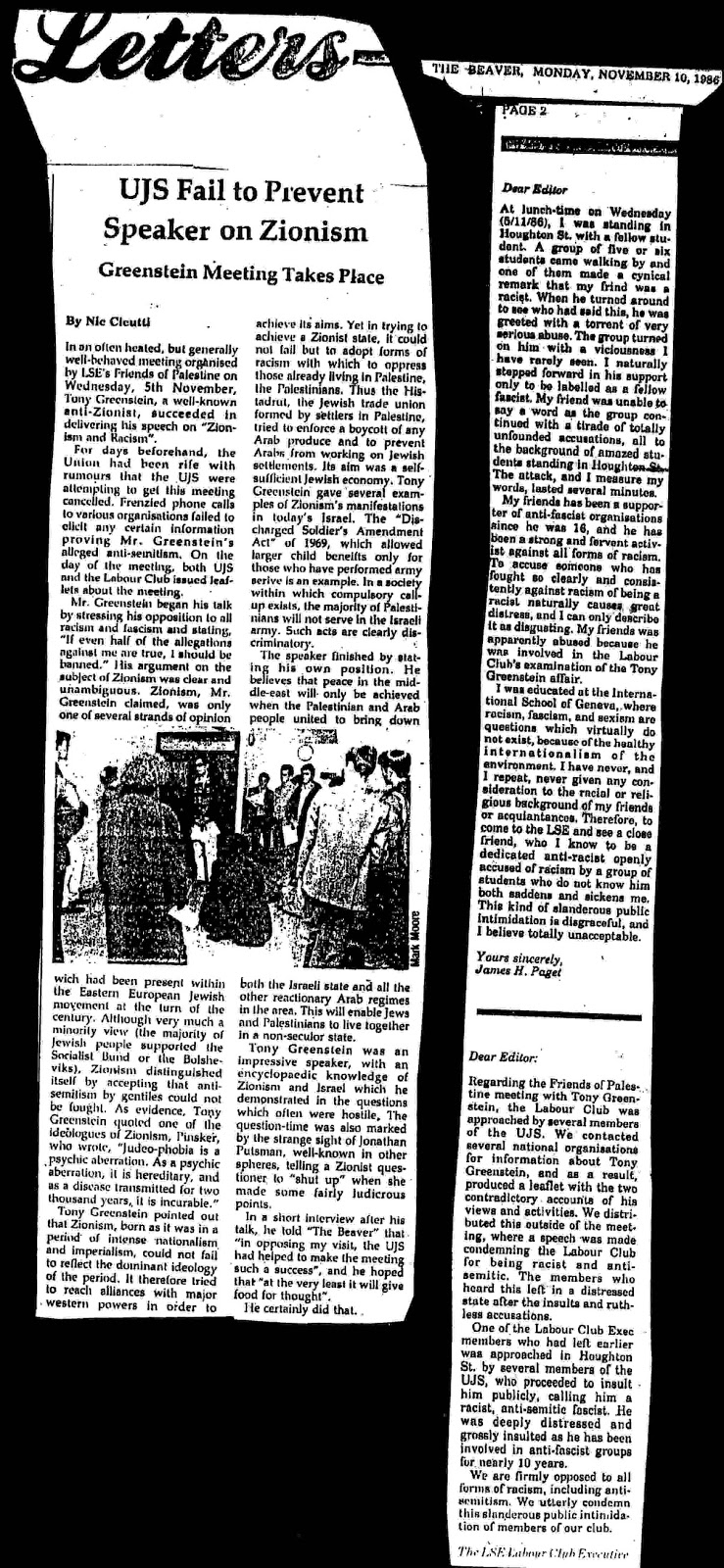 being anti-Semites and fascists! [Beaver, paper of the LSE Union 10.11.86.]