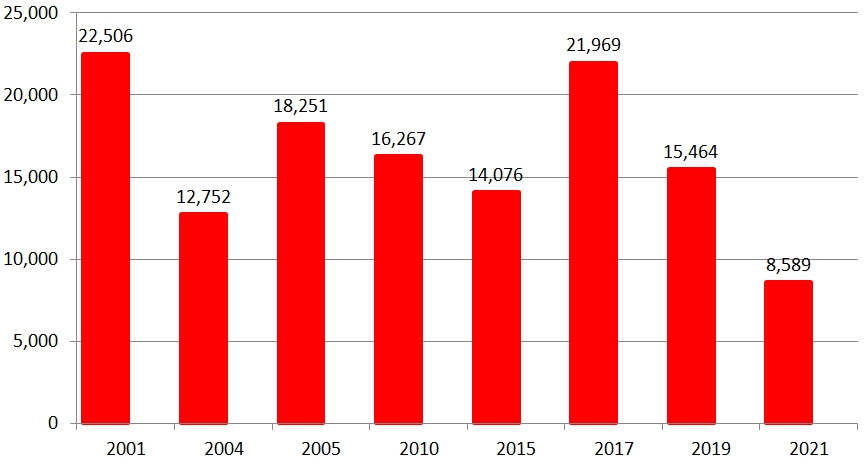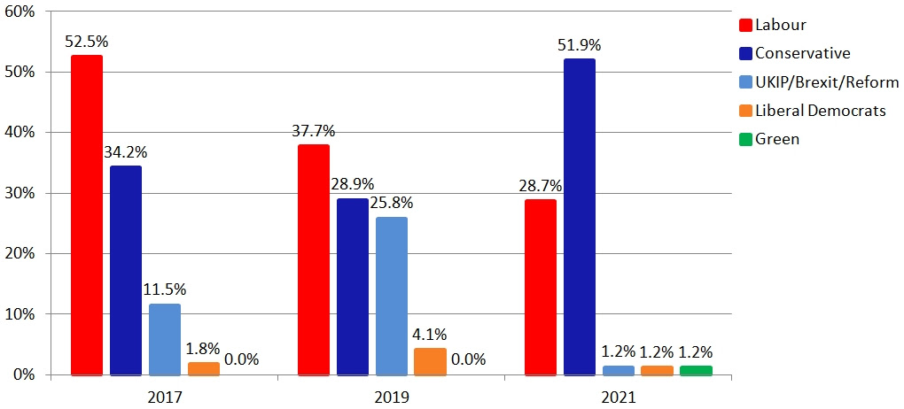 Hartlepool is a good example of the problems Labour faces. Created in February 1974 Labour gained 54.3% at the first election reaching a high of 60.2% in 1997 before dropping precipitously to 40.7% in 2005 under Blair. It dropped a further 5% in 2015 before recovering to 52.5% under Corbyn in 2017. In 2019 it dropped to 37.7%, still higher than under Ed Milliband. Under Starmer it has dropped a further 9%.