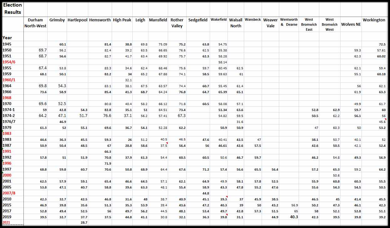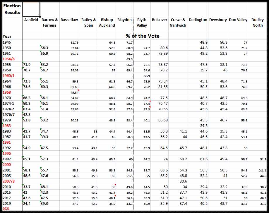 Or take Dennis Skinner’s old seat of Bolsover. When it was created in 1950 the Labour candidate gained over 80% of the vote. During the 1970s there was a slow decline to 66% in 1979. In the 80s it declined still further to the mid-50s recovering to 74% in 1997. By 2010 Labour had lost a third of its vote recovering slightly in 2017 to 52%. In 2019 just 36% of voters supported Labour and Skinner lost his seat.