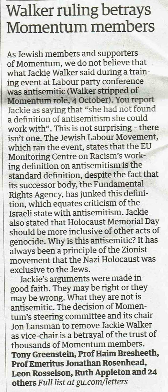 Momentum defending Jackie Walker. When one of your members, Ruth Appleton,