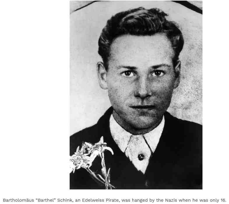 However the Gestapo hated them. In December 1942 in Dusseldorf the Gestapo rounded up over 1,000 and they were treated brutally. In Cologne there was a shoot out between the Pirates and the Gestapo in which the Chief of the Gestapo was killed. On 25 October 1944, Heinrich Himmler ordered a crackdown on the group and in November of that year, a group of thirteen people, the heads of the Ehrenfelder Gruppe, were publicly hanged in Cologne. The Edelweißpiraten hanged included six teenagers, among them Bartholomäus Schink, (Barthel), a former member of the local Navajos. Fritz Theilen survived.