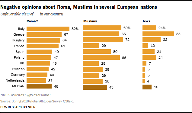 prejudice was recorded against Muslims and Roma Gypsies respectively than for