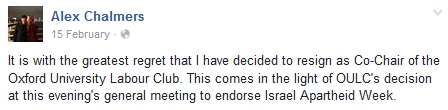 that Alex Chalmers, who resigned as co-Chair of Oxford University Labour Club