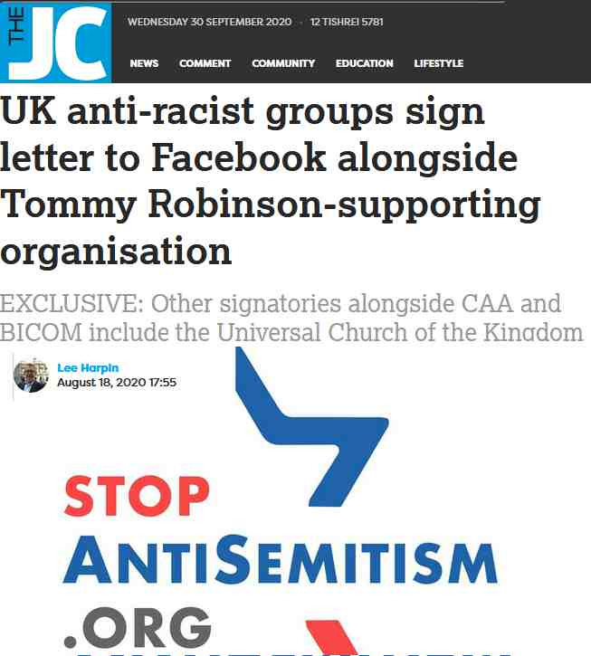 Other racist groups signing the Open Letter to Facebook include the Campaign Against Anti-Semitism, which openly lied to the Jewish Chronicle when it declares that it had no links to Tommy Robinson. In fact it works closely with the group of far-Right Zionists around Jonathan Hoffman and Paul Besser who themselves form a Zionist fan club for Robinson.