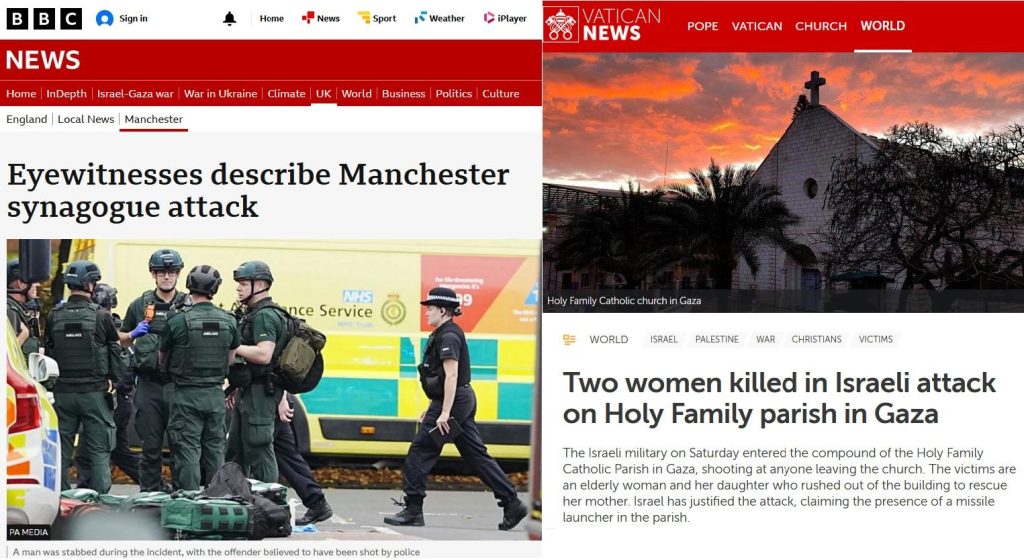 Read MoreThe Murder of 2 Jews at a Manchester Synagogue is as Despicable as Israeli snipers killing 2 Catholics at Gaza’s Holy Family Parish Church or Murdering Muslims in Mosques