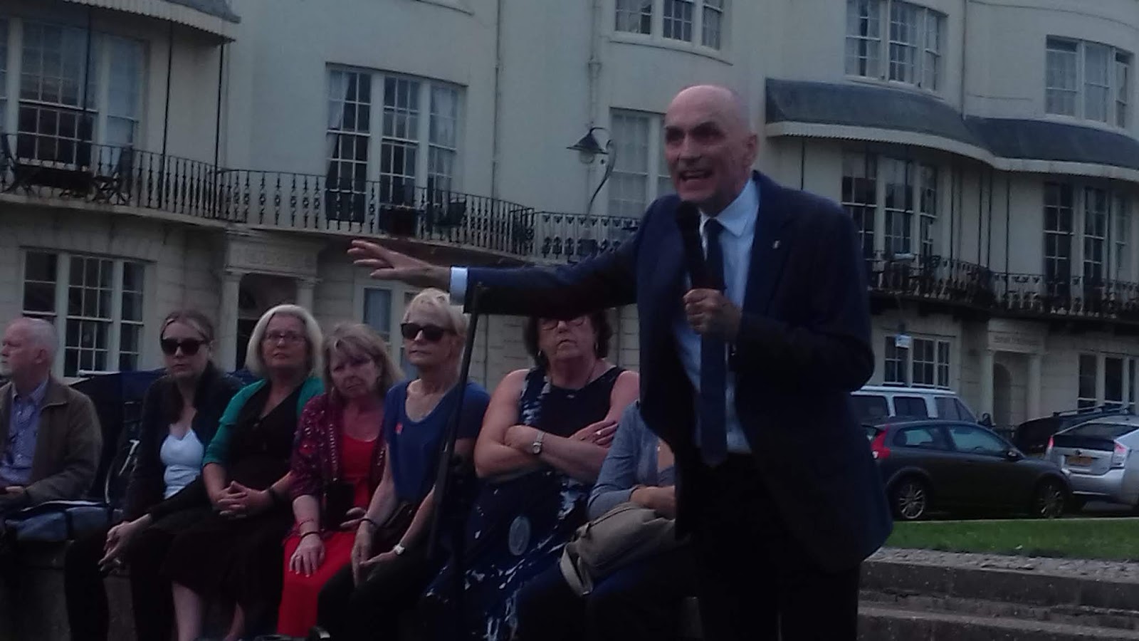 At 1 pm on Thursday we learnt of the cancellation and I have to confess that I was beginning to think that we might have to accept defeat. Full marks to Greg Hadfield who had the wits about him to hire an outside PA. Coupled with the good weather it was decided that we would hold the meeting outdoor in Regency Square in the finest traditions of the labour movement. Regency Square is a grand place and is, as its name implies, a place of some architectural interest.
