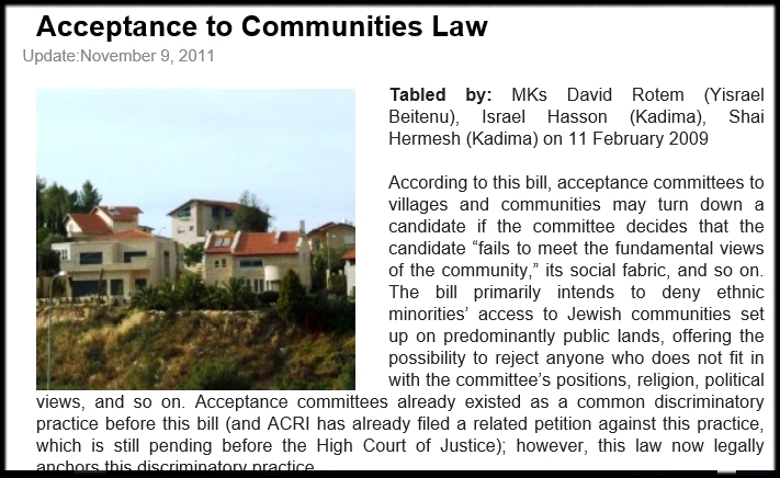 keep Arabs out of Jewish towns as they will have to ‘fit in’ and existing (Jewish) residents will have the final say on who is accepted into the community.