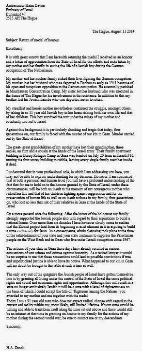 on Gaza. This letter was carried by the Guardian of 15th