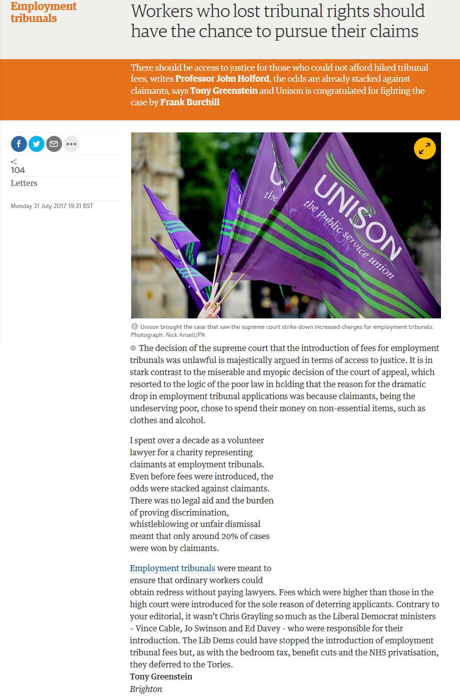 Three weeks ago I did a post Supreme Court Abolishes Employment Tribunal Fees – Thank the Lib Dems, Jo Swinson & Vince Cable for introducing them and also sent a letter into the Guardian.