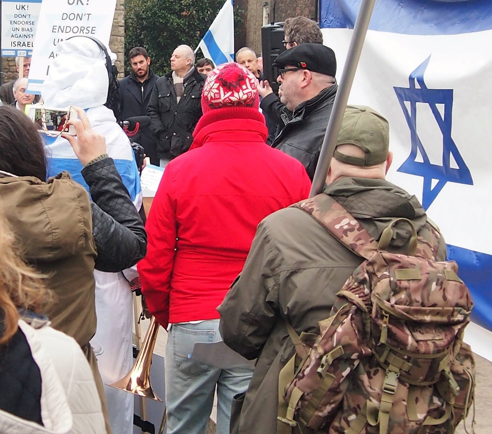 | An old photograph of the Ahava Zionists – note the same EDL member in the background and Roberta Moore in the foreground (plus Jonathan Hoffman of Zionist Federation) |