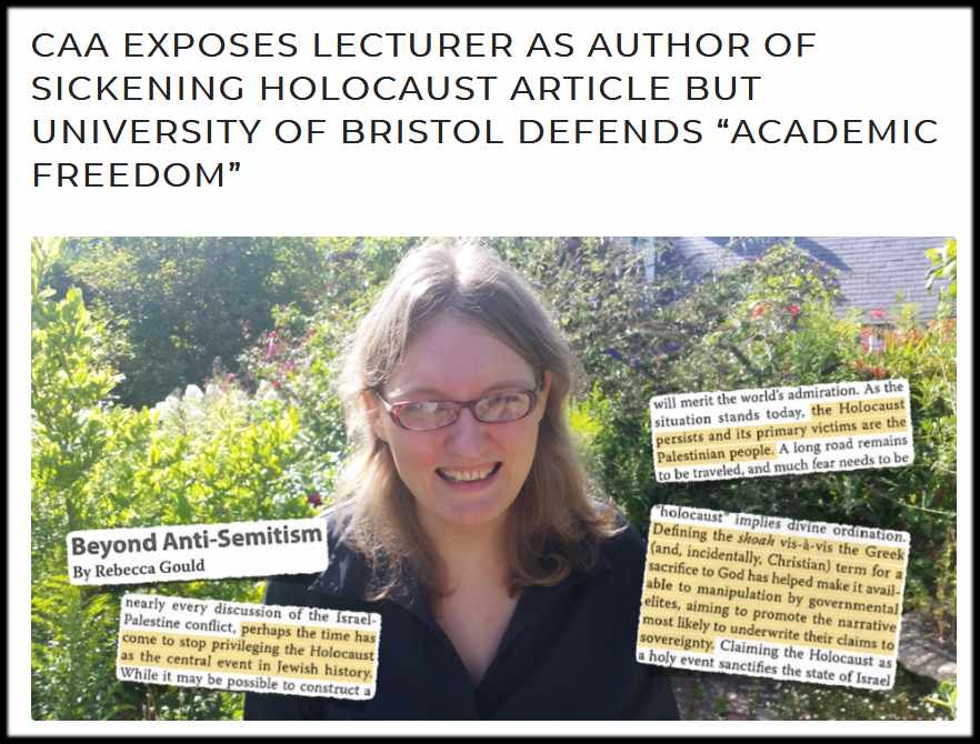 The CAA has been at the forefront of attacking academic freedom. Because she wrote an article ‘Defining Anti-Semitism’ in 2011 describing how the holocaust intimidates people into self-censoring their views on Israel. the CAA targeted Bristol University lecturer Professor Rachel Gould.