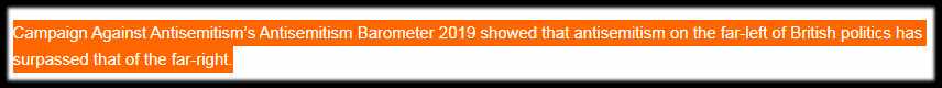 So when you read a CAA post that has the strap line that ‘Campaign Against Antisemitism’s Antisemitism Barometer 2019 showed that antisemitism on the far-left of British politics has surpassed that of the far-right’ you know that this is a consequence of pure chicanery and academic fraud. It has no basis in reality.