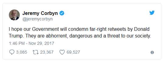 Prime Minister Theresa May said Trump was “wrong” to share the videos and said Britain First used “hateful narratives which peddle lies and stoke tensions.”
