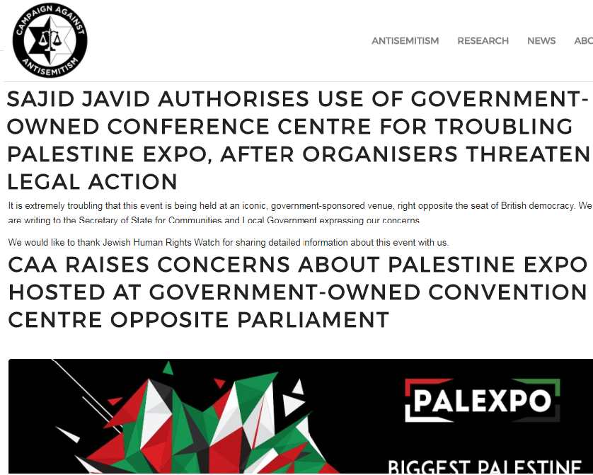 | The Bogus ‘Charity’ ‘Campaign Against Antisemitism’ did its best to have Palestine Expo Banned |
