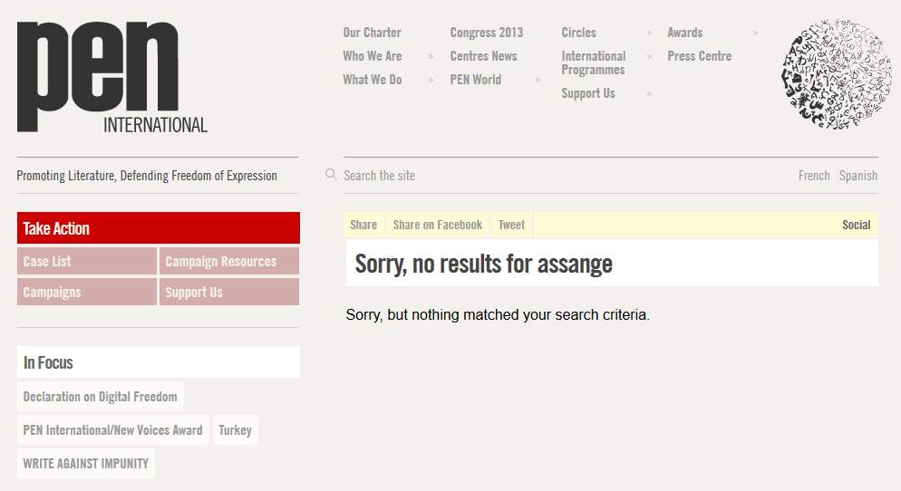 A search of its web site shows that these fine principles don’t, for some unfathomed reason, apply to the United States. I couldn’t find a single mention of Bradley Manning, the army soldier who gave Wikileaks thousands of documents concerning US Foreign Policy nor could I find any reference to Julian Assange either! Presumably there are limits to freedom speech as far as PEN is concerned.
