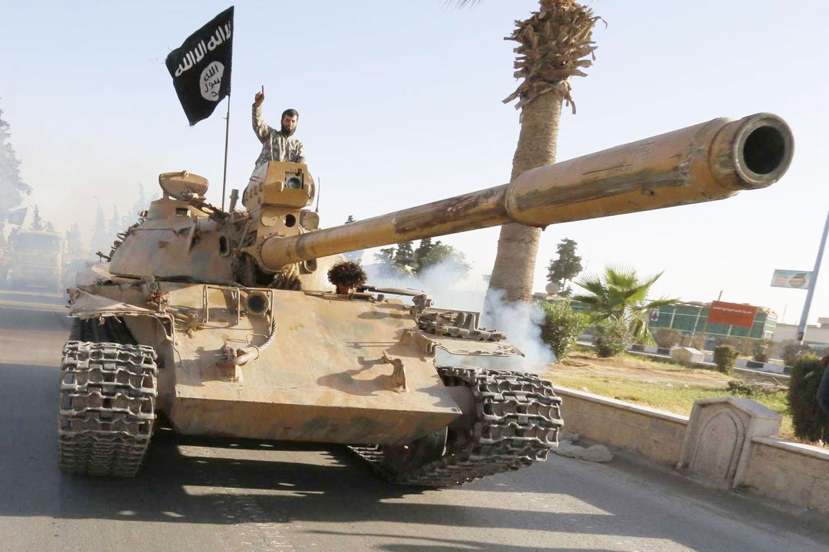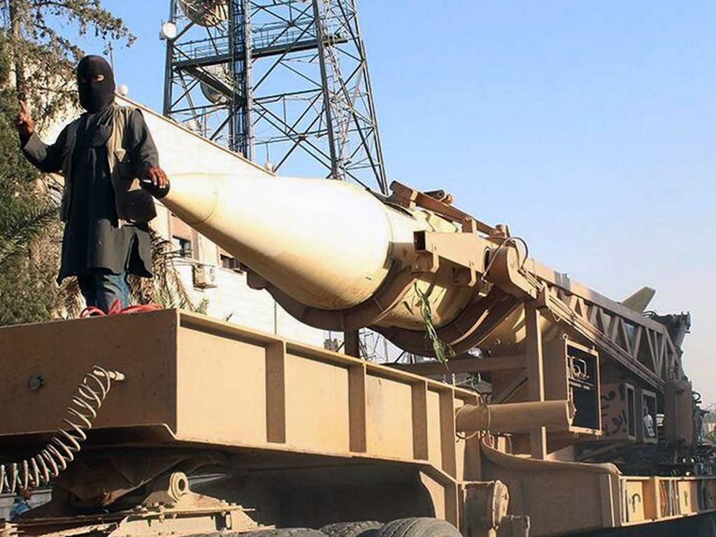 | Fighters from the Isis group during a parade with a missile in Raqqa, Syria. |