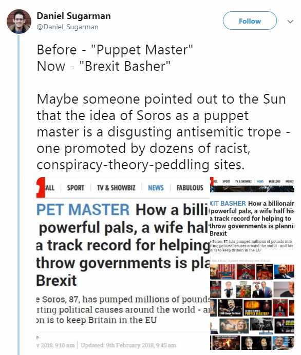 The Puppet MasterPuppet-master is a phrase that the Sun –on-line, also from the Murdoch stable, used to describe Soros before it was taken down. Even Daniel Sugarman, a journalist on the Zionist Jewish Chronicle managed to figure out that this was a ‘disgusting anti-Semitic trope’ emboding the traditional stereotype of the all-controlling Jewish financier.