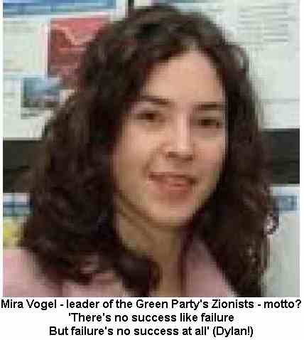 Stop Press – Despite all the frenetic activity on the Internet, when push came to shove ‘Green Engage’ the Zionist lobby within the Green Party, failed to even try to defend the JNF. And who can blame them? How do you justify an organisation that refuses to allow non-Jews to use its land? And when that land is 93% of the total in Israel it’s called apartheid. Even Mira Vogel is not a clever enough academic to spin that one!