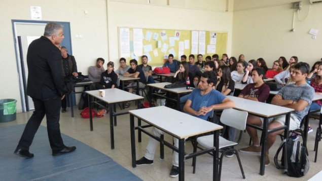 Yair Lapid of Yesh Atid, addresses Israeli classroom. Yesh Atid is ‘centrist’ but Lapid says he wouldn’t be comfortable if his son were to marry an Arab