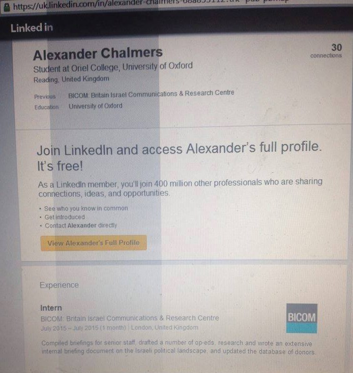 ex-intern at BICOM and a dirty tricks agent on behalf of the Zionists. His allegations of anti-Semitism at Oxford