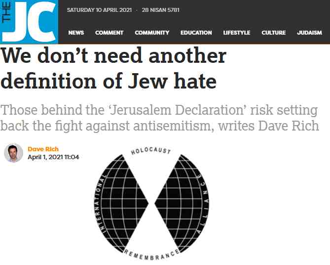 Dave Rich, the Deputy Director of the CST, an organisation that was set up by Mossad, Israel’s MI6 and the Board of Deputies, argues that the JDA ‘risks setting back genuine efforts to tackle antisemitism.’ Whereas in fact it is the IHRA, by defining anti-Zionism as anti-Semitism which does that.