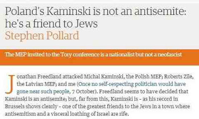 Indeed when Jonathan Freedland criticised the Tories for getting into the same sewer as Roberts Zile, the Latvian MEP who marched with the veterans of the Latvia Waffen SS each year and with the equally repugnant Michal Kaminski, who had defended the pogromists of Jedwabne who had the blood of up to 1600 Jews on their hands, who defended these fascists? None other than the Editor of the Jewish Chronicle, Stephen Pollard in an article Poland’s Kaminski is not an antisemite: he’s a friend to Jews. Pollard’s reasons were that Kaminski was ardently pro-Zionist which is true for many anti-Semites.