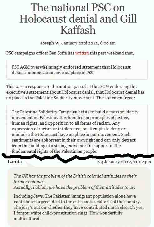 But whilst I have been banned, a Zionist poster Lamia was able to post the following comment to Joseph’s The national PSC on Holocaust denial and Gill Kaffash