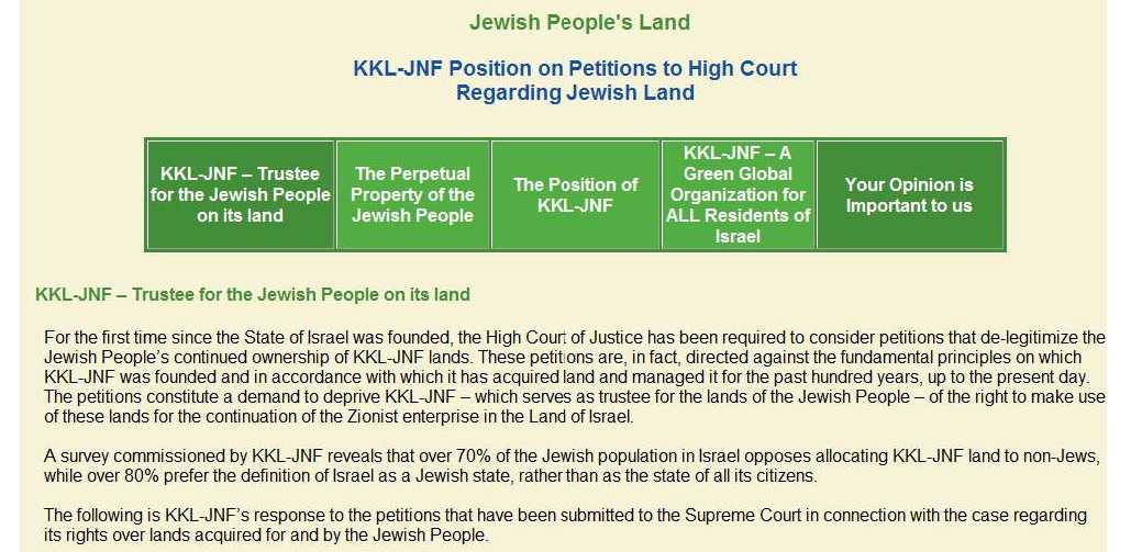 ‘For the first time since the State of Israel was founded, the High Court of Justice has been required to consider petitions that de-legitimize the Jewish People’s continued ownership of KKL-JNF lands. These petitions are, in fact, directed against the fundamental principles on which KKL-JNF was founded and in accordance with which it has acquired land and managed it for the past hundred years, up to the present day. The petitions constitute a demand to deprive KKL-JNF – which serves as trustee for the lands of the Jewish People – of the right to make use of these lands for the continuation of the Zionist enterprise in the Land of Israel.’