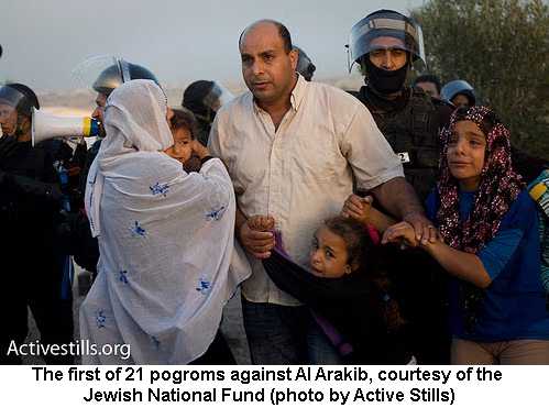Since the JNF has set its sights on Al Arakib, the village has been destroyed 21 times. Israeli police have used rubber bullets, percussion grenades, teargas, batons and bulldozers against women, children, and the elderly — all unarmed — in their effort to remove the Bedouin un-people from the area so the JNF can go to work. During the first destruction of Al Arakib, a squad of Israeli high school age students were hired to remove belongings from the homes of Al Arakib residents — the “Summer Camp of Destruction.” The students vandalized homes in the process and reportedly belted out the familiar “Am Yisrael Chai!” when the bulldozers moved in. ILA bulldozers accompanied by riot police have attempted to destroy and desecrate the Al Arakib cemetary, which contains graves more than a century old. And recently, the Israel State’s Attorney Office has announced plans to sue the residents of Al Arakib for $1 million shekels for the demolition of their own homes.