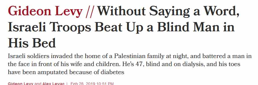 Yet this is what Lansman, Owen Jones, Watson and Berger are all signed up to. Because according to the above named if you criticise Zionism, the ideology that created the Israeli state as an ethno-nationalist Jewish state then you are ‘anti-Semitic’. Tony Greenstein Without Saying a Word, Israeli Troops Beat Up a Blind Man in His Bed Gideon Levy Israeli soldiers invaded the home of a Palestinian family at night, and battered a man in the face in front of his wife and children. He’s 47, blind and on dialysis, and his toes have been amputated because of diabetes