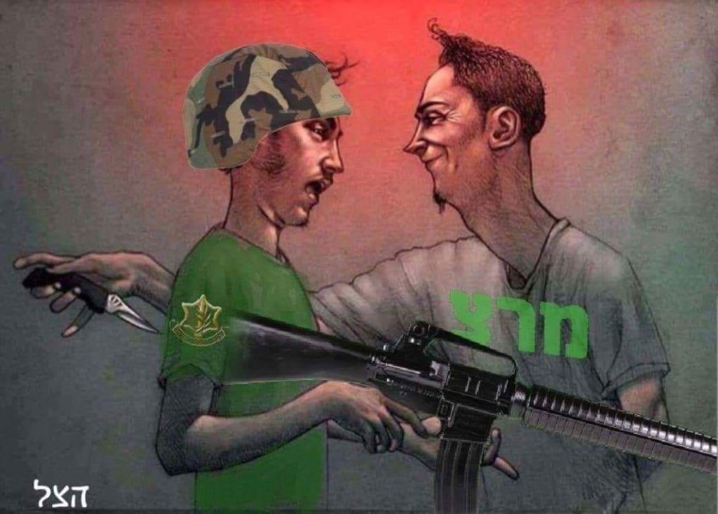 | Shadow cartoon featuring Meretz supporter knifing IDF soldier in back |