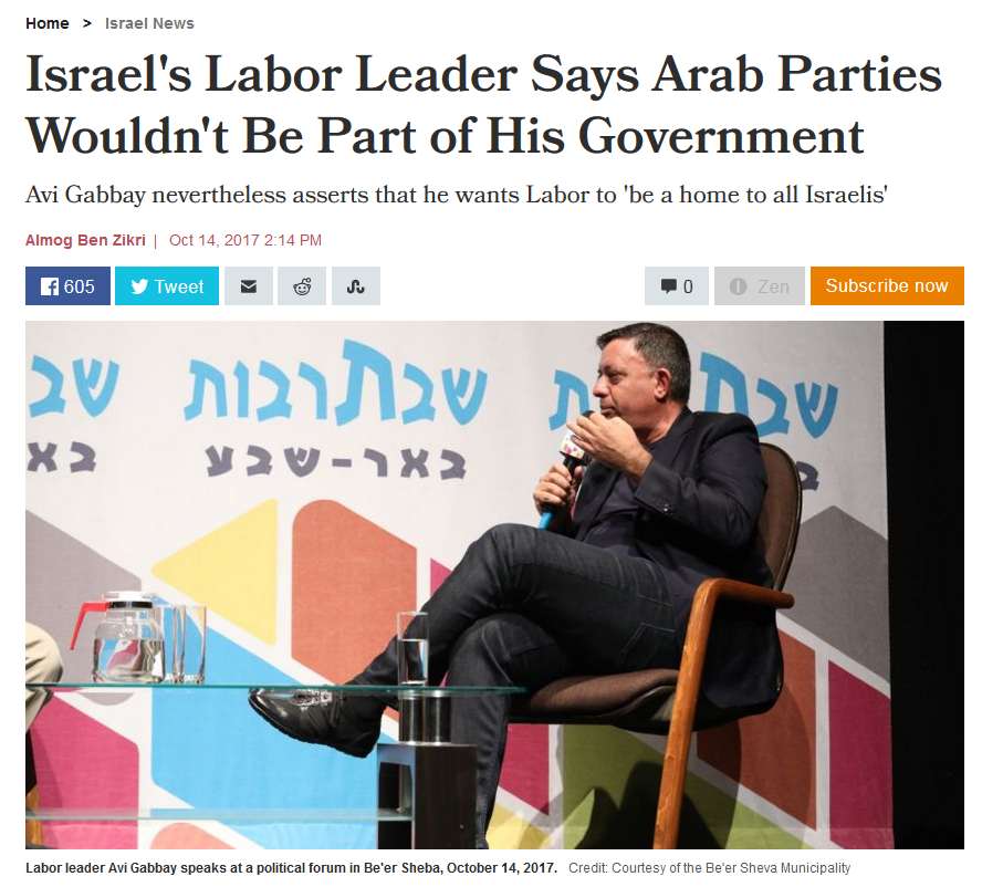 | Israeli Labour Leader Avi Gabbay reiterates Israeli Labour’s traditional hostility to the Palestinians and Israel’s Palestinian citizens |