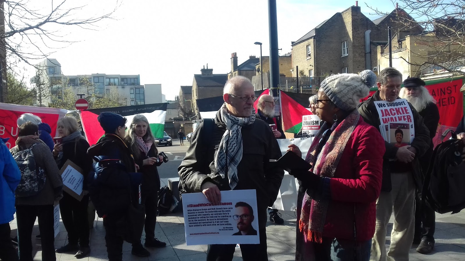 I arrived shortly after 9 a.m. with my son to find about 100 people, Black and White, with banners from Jewish Voice for Labour and Labour Against the Witchhunt amongst others flying, as people assembled to protest against the gross unfairness of the witch-hunt as it was now being played out in front of a bevy of well-paid Labour lawyers. The hearing was being held at the Deptford Lounge, a community centre with a library and computers, in a multi-racial area where Jackie grew up. No doubt it was situated as far away as possible from Labour HQ in order to avoid protests spilling over to Labour’s NEC which was also meeting at the same time.