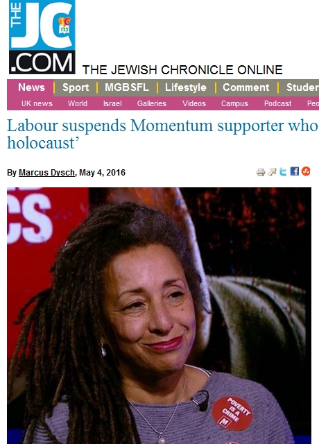 part of a McCarthyite witchhunt against supporters of Jeremy. As if to prove the point, the latest victim is my own partner and anti-racist campaigner, Jackie Walker, of mixed heritage (Afro- Caribbean and Jewish), outrageously suspended from the Labour Party, simply for telling the truth that her Jewish ancestors were involved in financing the Slave Trade, that the African holocaust was even worse than the Jewish holocaust, and that anti-Semitism is not a major problem in Corbyn’s Labour Party.