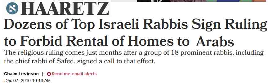 In 2010 the Chief Rabbi of Safed, Shmuel Eliyahu, issued an edict forbidding Jews to rent homes or property to Arabs. He was backed up by dozens of other Israeli rabbis, all of them paid state officials. To this day Arabs are barred from renting rooms in Safed or similar cities.