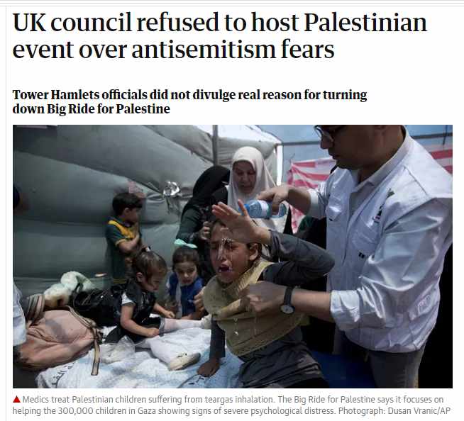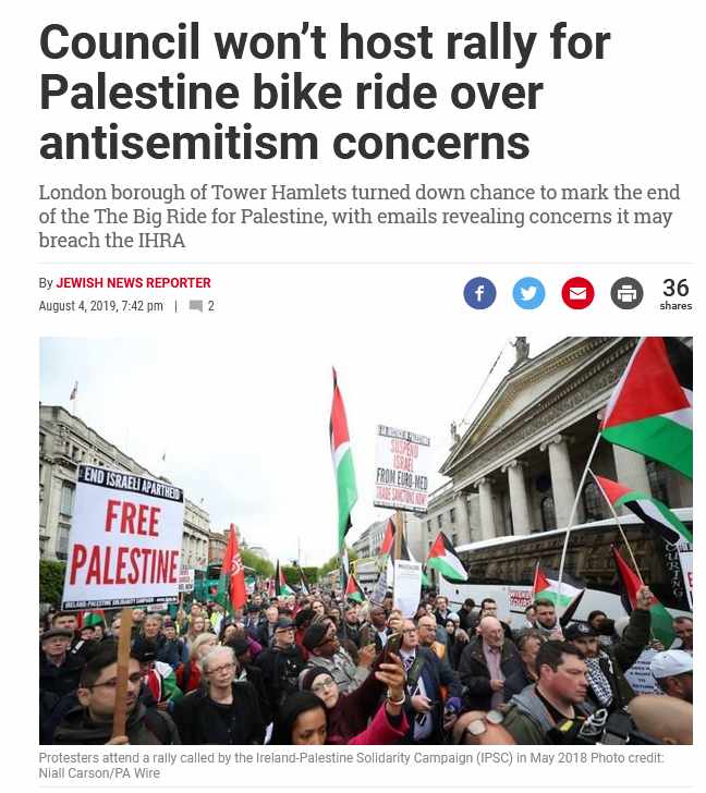 On Saturday 27th July Big Ride for Palestine, which raises money for sports equipment for children in Gaza, was prevented from using a park for their rally in Tower Hamlets. This was because of a decision by Tower Hamlets Council to adopt the IHRAdefinition of anti-Semitism which conflates opposition to Zionism and the Israeli state with anti-Semitism.
