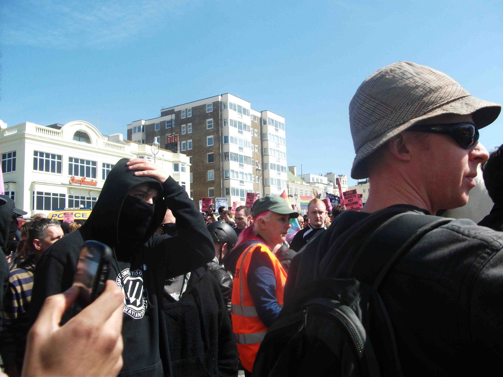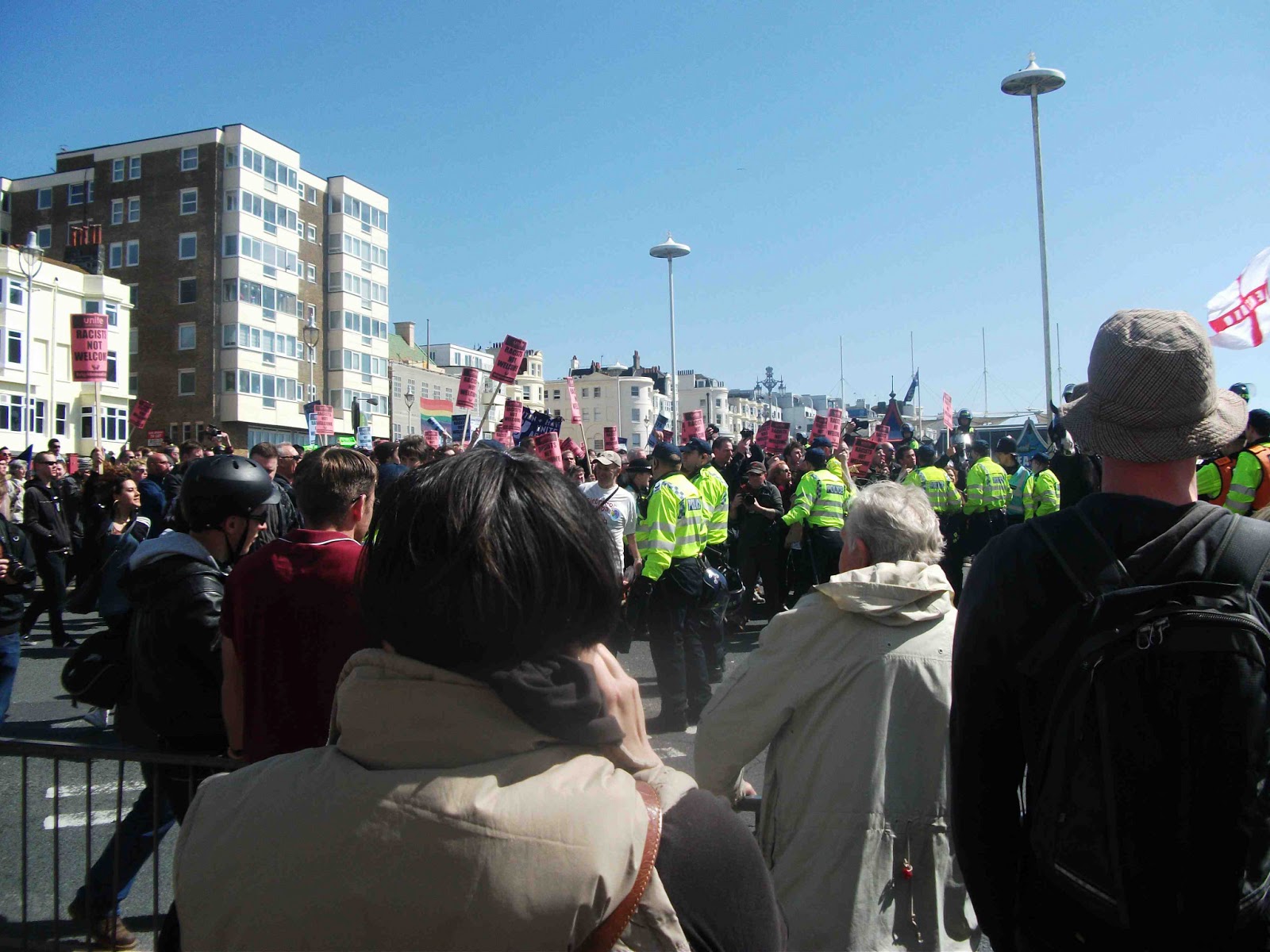 The day itself began with a victory. The Police wouldn’t countenance a march through Brighton from the railway station after last year’s debacle in which they got less than half way before being diverted down side streets. Fascists are no longer able to march at whim through town and had to be content with shouting at the piers.