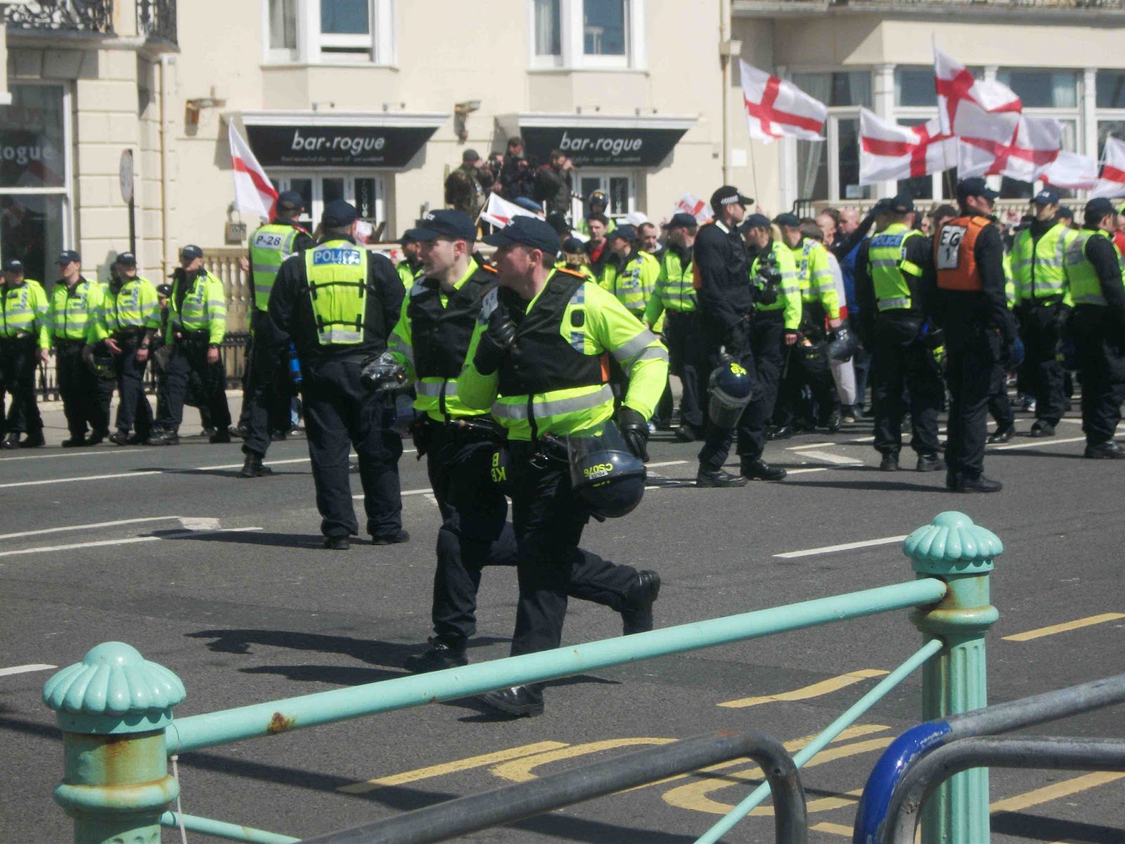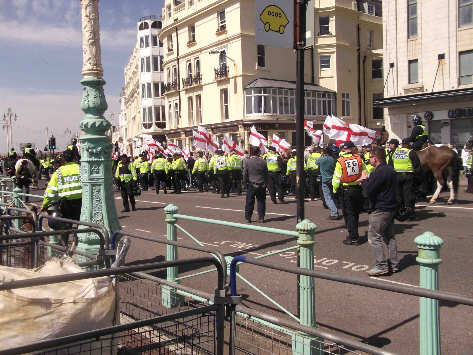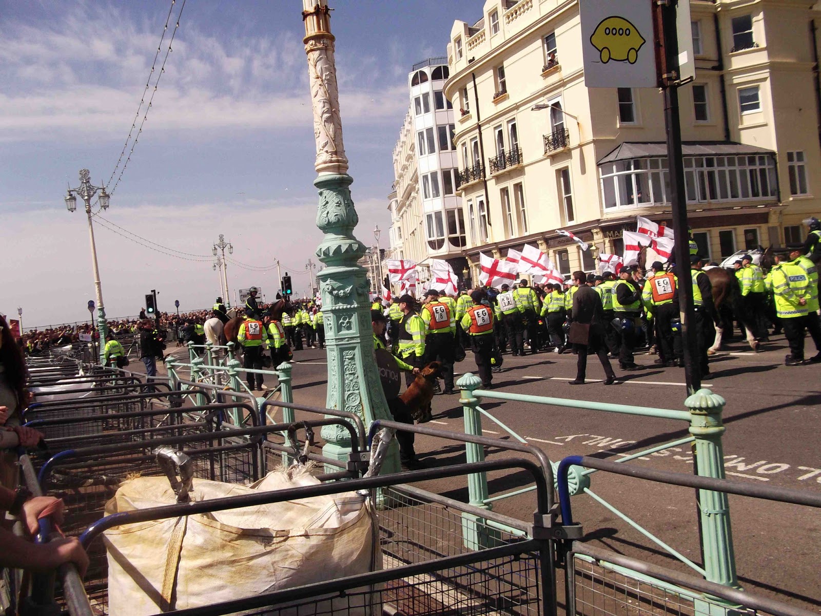 As it is the EDL held a short march between the piers inside what was effect a mobile police kettle. As people shouted at them, ‘no one can hear you anyway’ and that was true. All you could see is them gesticulating. It is alleged that a bottle was thrown at them. This blog, of course, doesn’t condone wanton violence but I’m glad to report that the bottle is making a full recovery though the skull it hit is beyond repair.