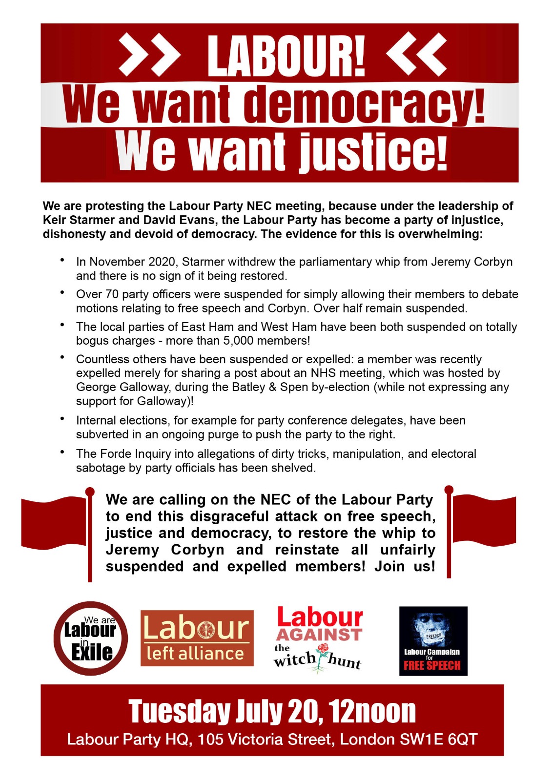 If you have been suspended or expelled you or they are trying to silence your local party then you should come to this protest-lobby of the NEC at 12 noon this Tuesday 20 July and tell your story. Email Norman on [email protected] to let us know.