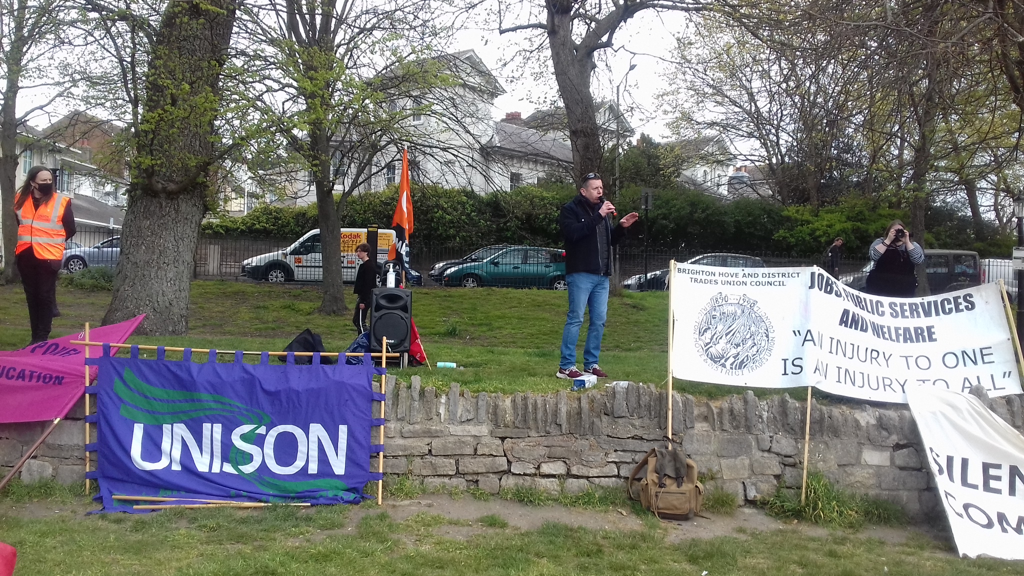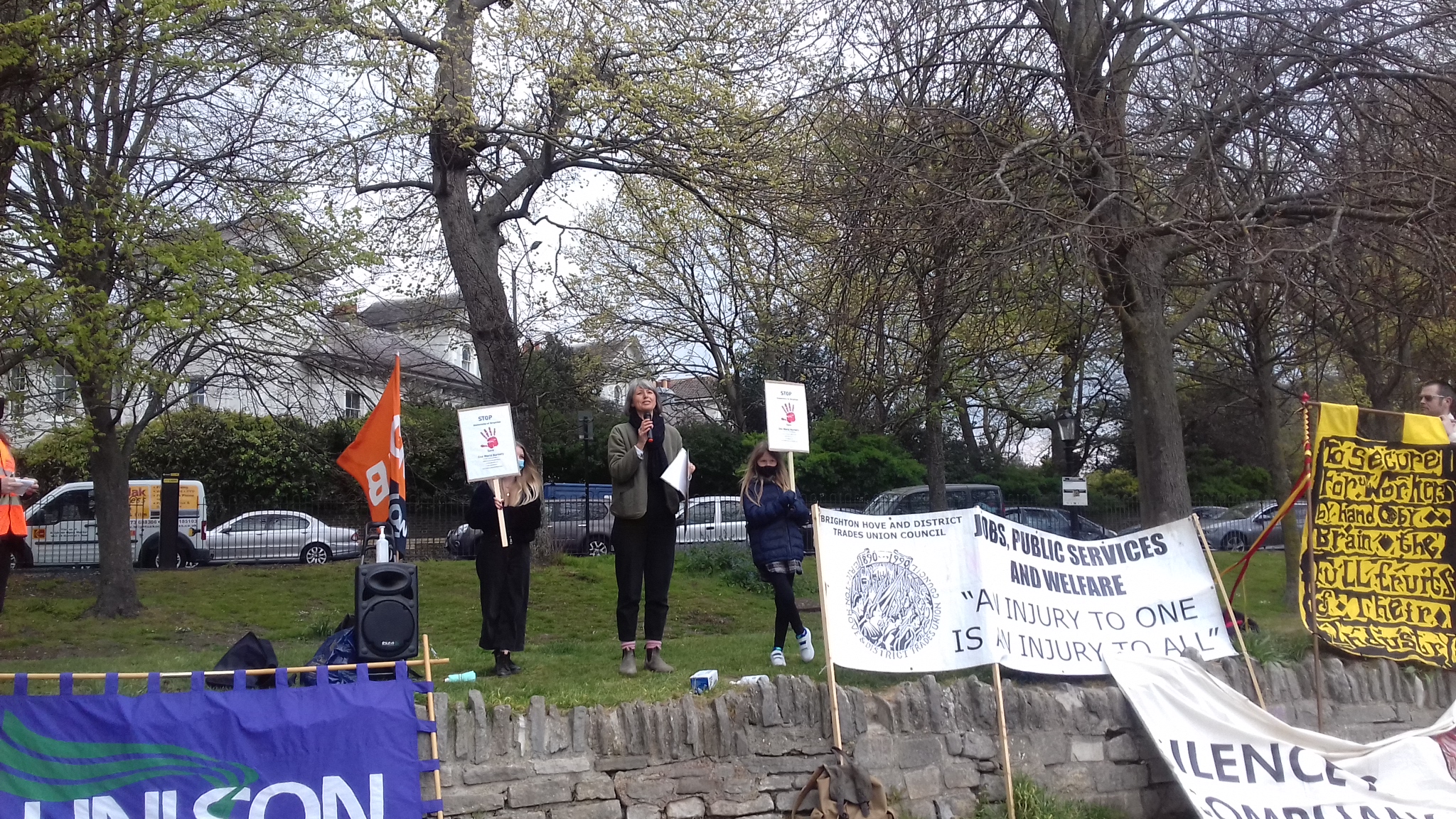 The main speaker was Howard Beckett, the left’s candidate in the Unite General Secretary election. There were a host of other speakers including Mark Abel from UCU, Sue from the Campaign to Save Brighton University’s One World Nursery, Matt Webb, Secretary of the Trades Council, Lloyd-Russell Moyle MP for Brighton Kemptown, Steve from Save the NHS campaign and myself.