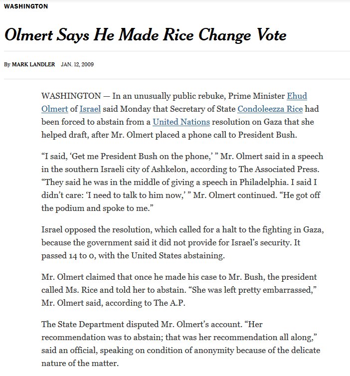 Condoleeza Rice, the Secretary of State, to abstain in a UN vote. Olmert