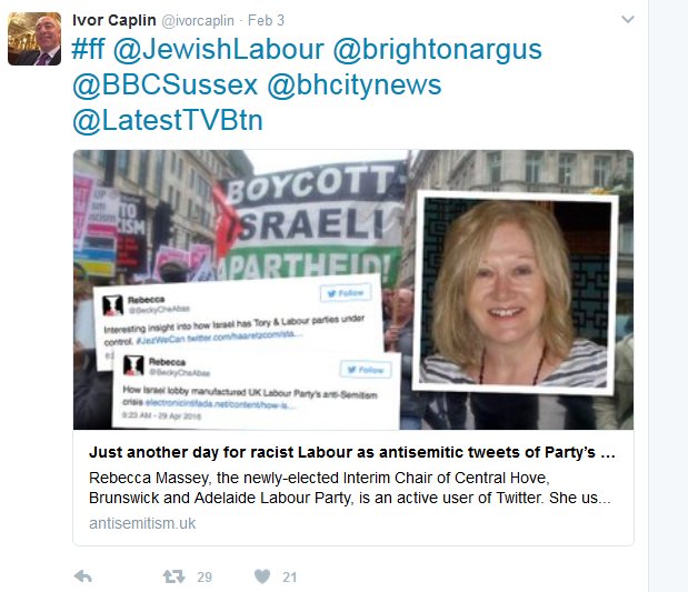 On Friday the right-wing Zionist charity, the Campaign Against Anti-Semitism printed a scurrilous article on their web site, Just another day for racist Labour as antisemitic tweets of Party’s Chair in Hove, Brunswick and Adelaide revealed. The basis of this allegation of anti-Semitism were two tweets.