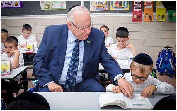 | President Reuven Rivlin seen at the Talmud Torah Boston school in Bnei Brak during the opening of the new academic school year. August 23, 2017. (Mark Neyman/GPO) |