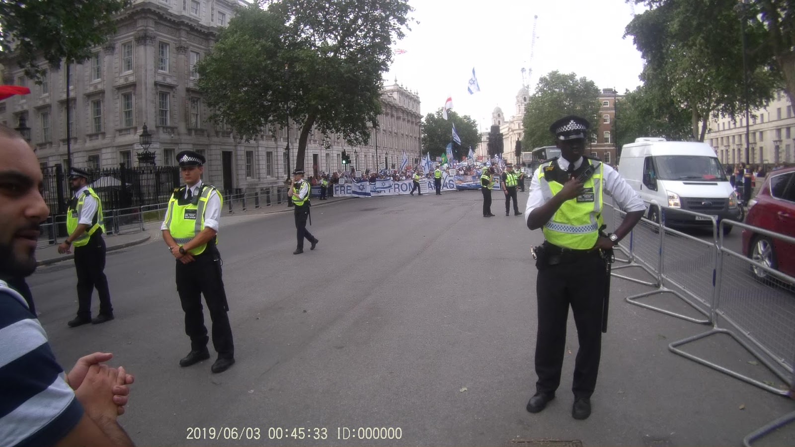 Danny Tommo in discussion with the Police and Stephen Silverman of the dodgy charity CAA , standing by far-right thug and convicted criminal Danny Tommo as he harasses the Police and peaceful Al Quds Day marchers outside the Home Office. Tommo, a close associate of Tommy Robinson, also claimed he is a “journalist” is well “known” to the police. He was sentenced to 2 years in prison for a drugs gang-related feud in Portsmouth.