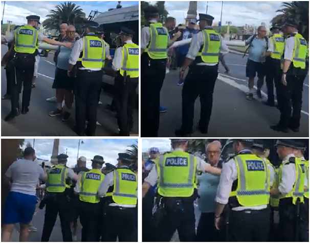 At the Al Quds demonstration Jonathan Hoffman and Damon Lenszner refused to join the police-approved Zionist counter-demo in Downing St.and attempted to block the peaceful Al Quds Day march on the Embankment. They were accompanied by Michael English, a convicted small-time Manchester petty criminal well-known to the police. English was recently interviewed by the Manchester Counter-terrorism Police as they were concerned he might use physical violence against Palestinians. Also present was Paul Besser, the former “head of intelligence” for the fascist Britain First where he cavorted with BF bosses Paul Golding and Jayda Fransen. This group of thugs also attempted to cause trouble at the same event last year.
